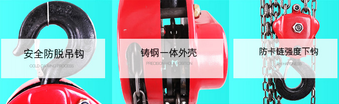 構(gòu)造:上掛勾、下掛勾、手拉式傳動鏈條、起重鏈條、拉鎖輪、起重吊裝主輪、管理中心輪、掛勾商業(yè)保險銷。