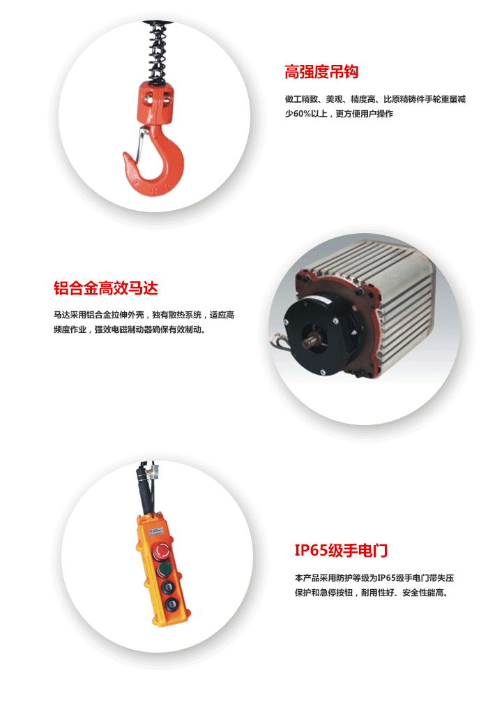 5、極限開關(guān):吊上吊下都有極限快關(guān)裝置,使電機(jī)自動(dòng)停止,反防止鏈條超出,確保安全。