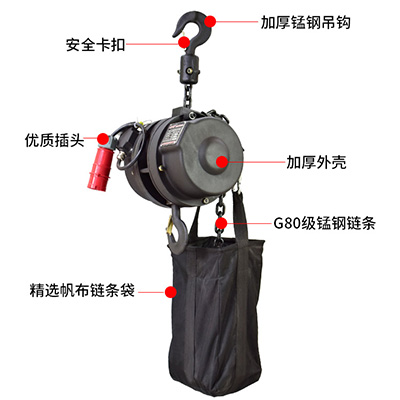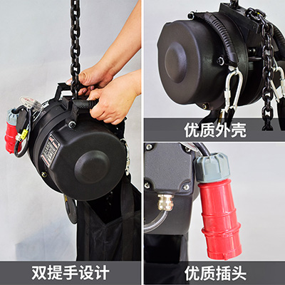 單鏈一噸速度2M/min,圓形對(duì)稱結(jié)構(gòu),專門防雨淋設(shè)計(jì),摩擦式過(guò)重保護(hù),整體式鋼制導(dǎo)鏈罩,沖頂及環(huán)鏈打結(jié)保護(hù),36V間接式控制方式安全便捷。優(yōu)質(zhì)外殼,堅(jiān)固耐用,G80級(jí)錳鋼鏈條,高效強(qiáng)韌,優(yōu)質(zhì)插頭,安心使用;舞臺(tái)專用倒掛葫蘆,表面黑漆處理,光亮持久;