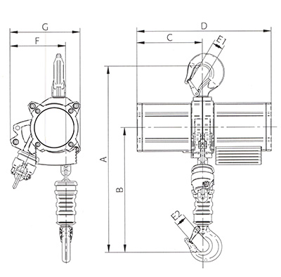 結(jié)構(gòu):①風(fēng)動馬達(dá) ②動力閥 ③減速器 ④制動器 ⑤中心架 ⑥鏈條 ⑦上、下吊鉤結(jié)合 ⑧操縱閥 ⑨限位裝置