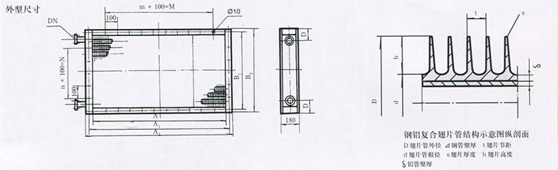 | 外徑D(mm) | 翅片高度h(mm) | 翅片厚度s(mm) | 翅片節(jié)距t(mm) | 鋁管壁厚h(mm) | 鋼管壁厚h(mm) | 總外表面積Sw(m2/m) |